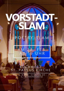 Am 28.02. um 19 Uhr ist es soweit und die Veranstalter, Podcaster, Moderatoren und vor allem Poetry-Slammer Lea Kottek und Timo Küsel kommen nach Buchholz in die Paulus Kirche. Mit im Schlepptau haben sie 5 ausgewählte Poetry-Slammer aus Hamburg und Umgebung, um Sie von der Schönheit der Sprache zu begeistern. Das besondere daran, Sie haben die Macht und die Entscheidungsgewalt einen der Künstler als Sieger des Abends zu küren und ihn mit einem Preis und Ruhm und Ehre nach Hause gehen.
