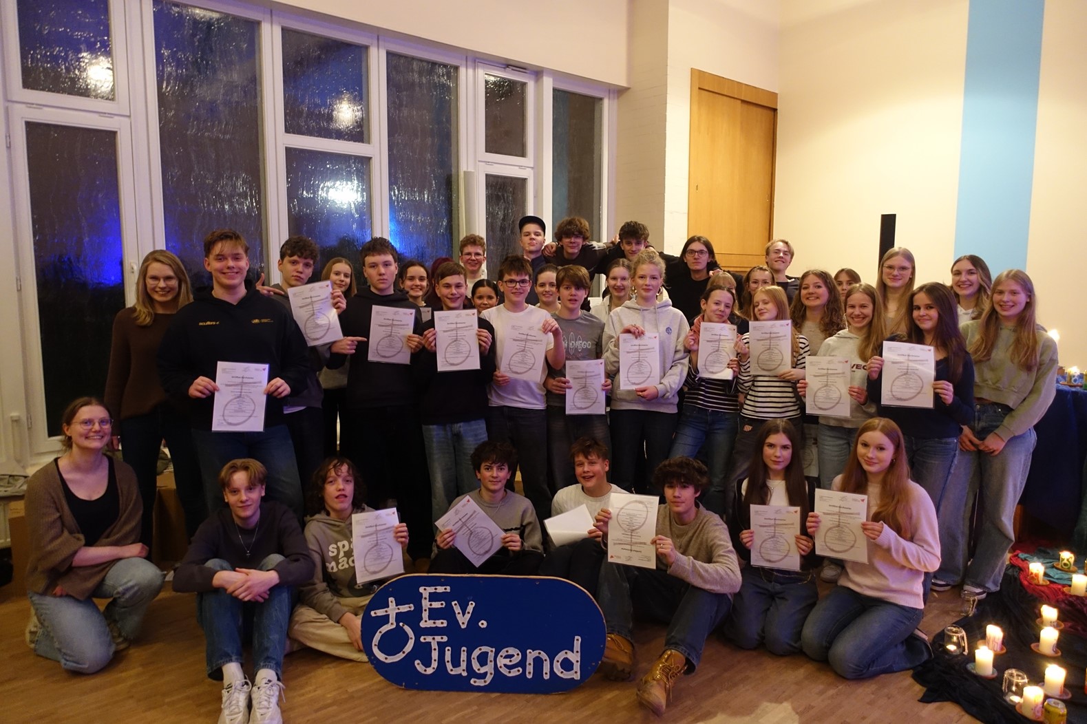 25 Jugendliche haben den Kurs erfolgreich abgeschlossen. Ein gutes halbes Jahr lang haben sie sich regelmäßig getroffen, um als ehrenamtliche Teamer:innen in der Ev. Jugend fit zu werden für die Begleitung von Aktionen, Freizeiten und Projekten. Im Kurs lernten sie u.a. Themen wie Gruppen- und Spielpädagogik, Spiritualität, Feedback und Recht kennen.